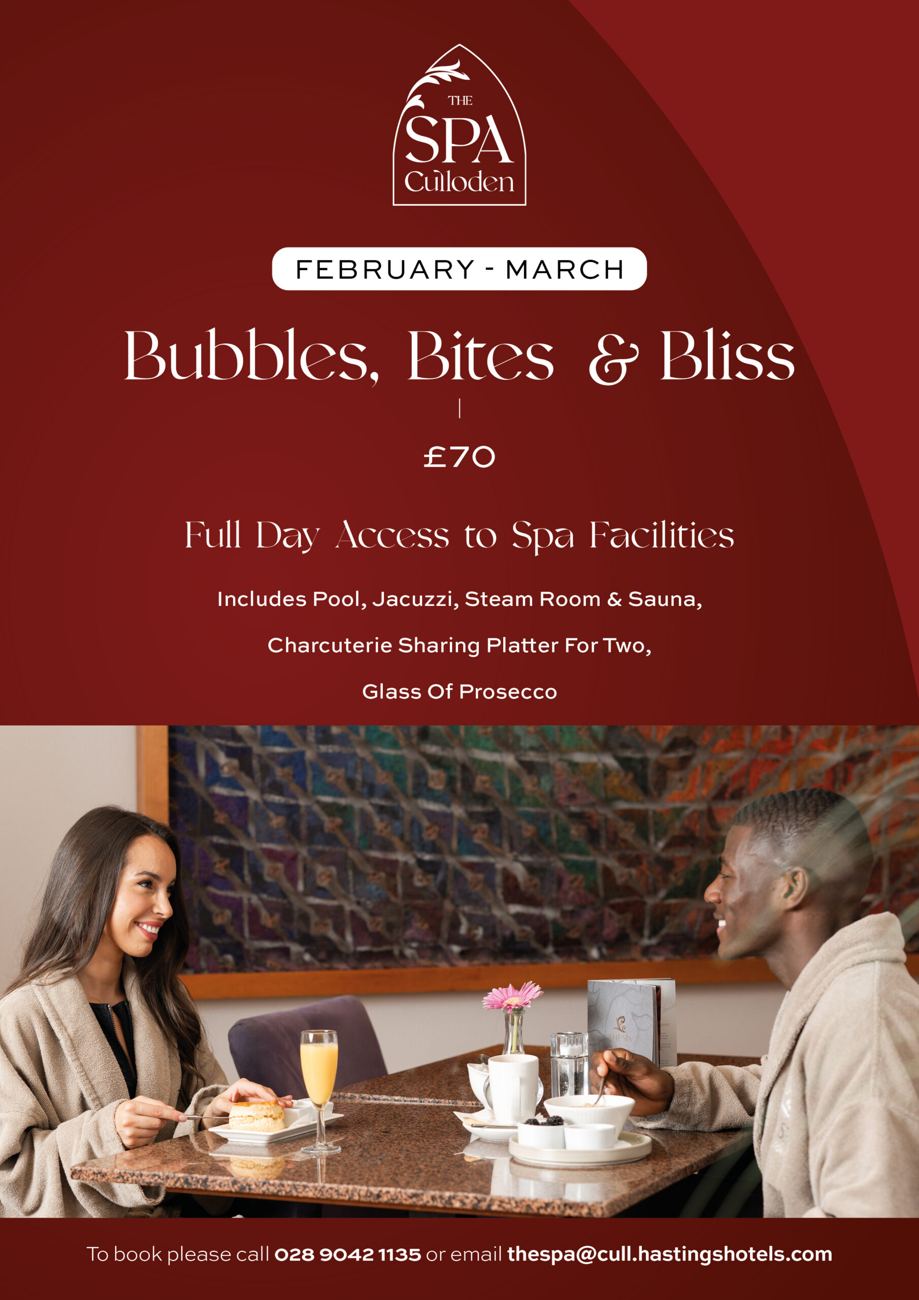 After your treatment, unwind in our tranquil relaxation areas before revitalising yourself with our thermal experiences, including the Eucalyptus Steam Room, Jacuzzi, Rainforest Shower, Swimming Pool, and Sauna with tranquil views over Belfast Lough. With a variety of therapies tailored to pamper and rejuvenate, The Spa at Culloden is the perfect escape for those who want to put the world on hold and take time for self-care.